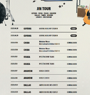 이번 고양 공연을 시작으로 방탄 진의 첫 솔로 월드투어는 총 9개 도시에서 18회의 공연이 예정되어 있습니다. 일본 치바, 오사카를 비롯하여 미국 애너하임, 달라스, 탬파, 뉴어크, 영국 런던, 네덜란드 암스테르담 등 세계 각지에서 팬들과 만날 예정입니다. 해외 공연 티켓 예매 일정은 각 지역별로 추후 공지될 예정이니 확인하시기 바랍니다.
