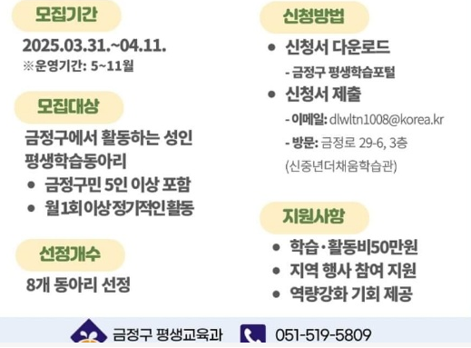 - 대상: 금정구에 거주하거나 활동하는 성인 5인 이상으로 구성된 학습 동아리